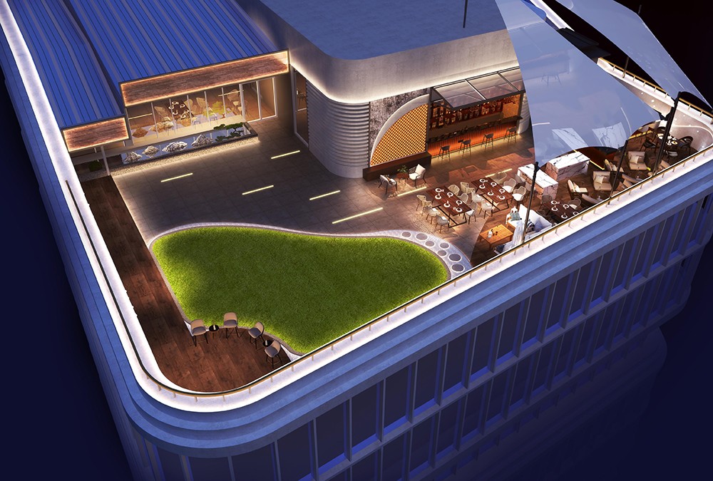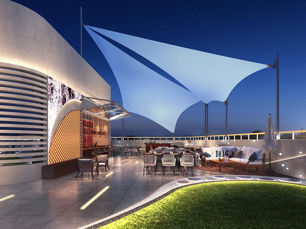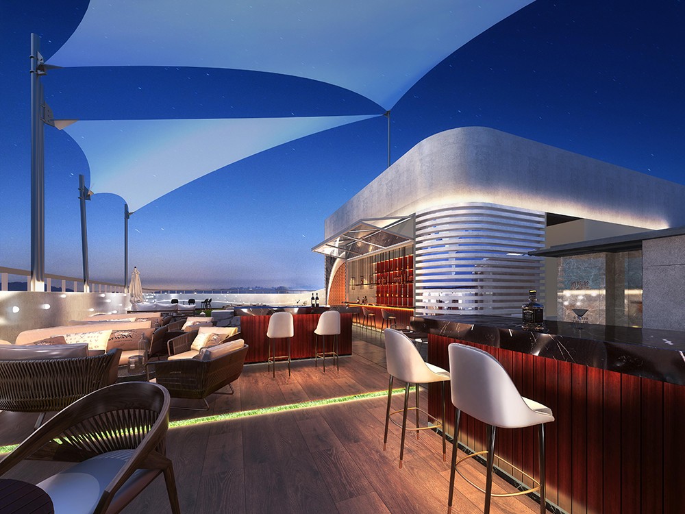 設計理念:室外開闊的明堂,水流猶如天上之水祥降而下,營造來水環繞的景觀。圍欄上跳動的線條,與天上的星空相接點點的繁星,流光似水。帶有韻味的用餐環境,以山作為背景,加上水波紋作天花,這樣可以營造一個山環水抱的祥和景象,寓意著四海朋友匯聚的地方。