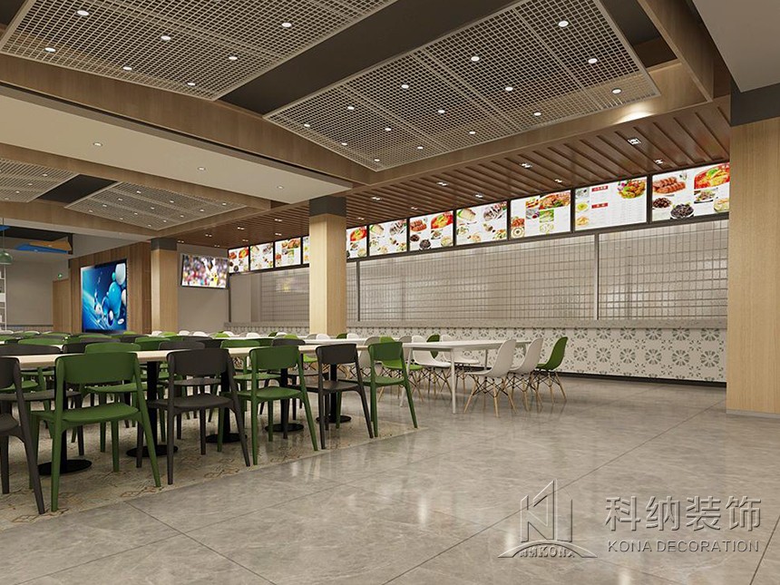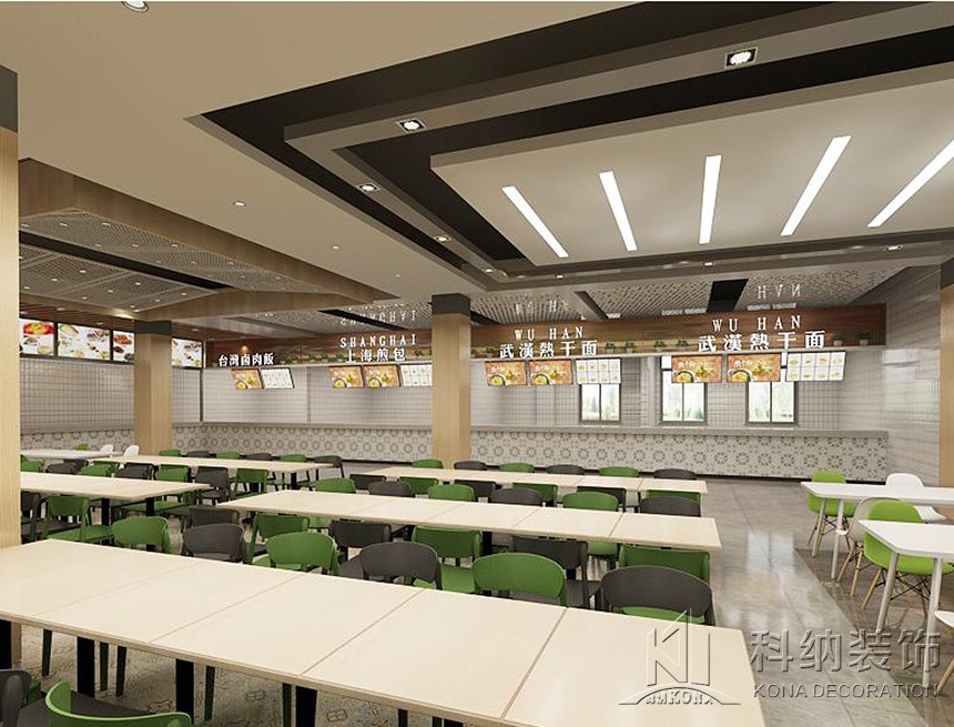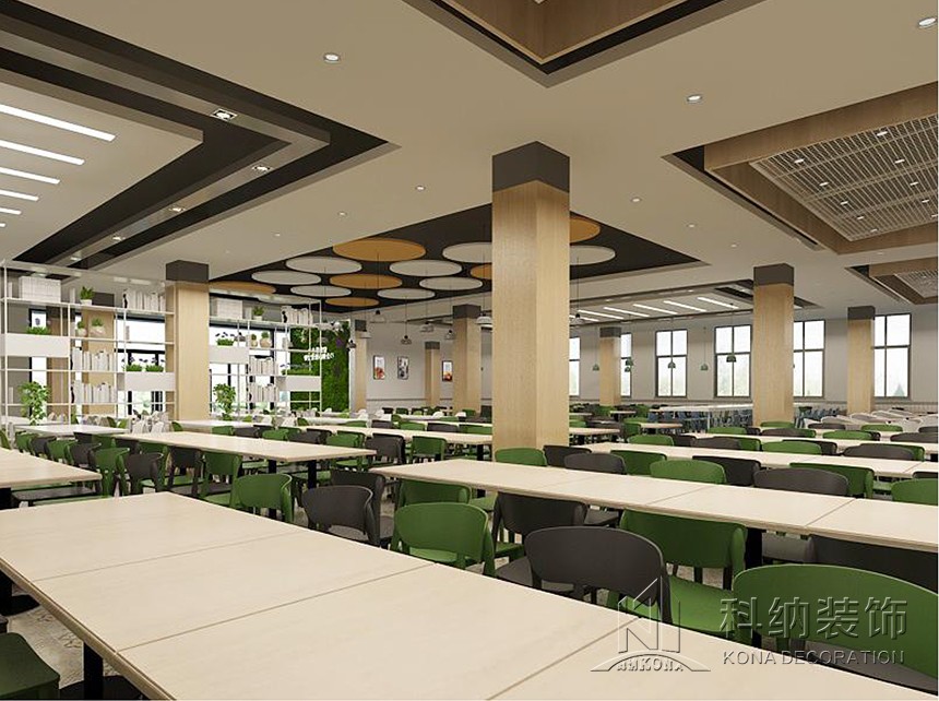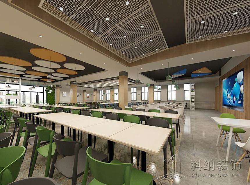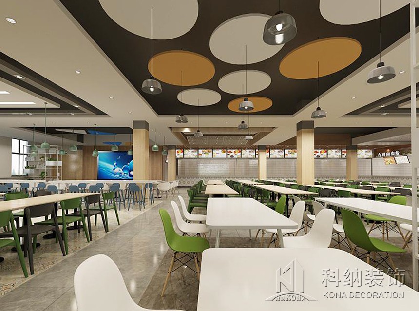 設計理念:休閑區的設計應用鮮艷色彩,課后的學生來到體驗休閑愜意讓人心曠神怡。學術交流區應用了可組合的桌椅做搭配,造型吊燈使整個空間顯得生動有趣考慮到多人活動,方便學生自由組合。團體就餐區橫向舒展的開放式桌椅布局給予一層空間通透且自由的氛圍,由此顯露出交互的趣味性與工作的靈活性。大眾就餐區的設計以暖色調為主,以色彩鮮艷的桌椅做點綴,為空間增加活躍氣息。