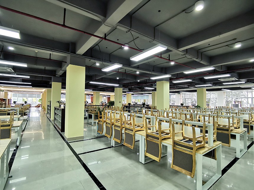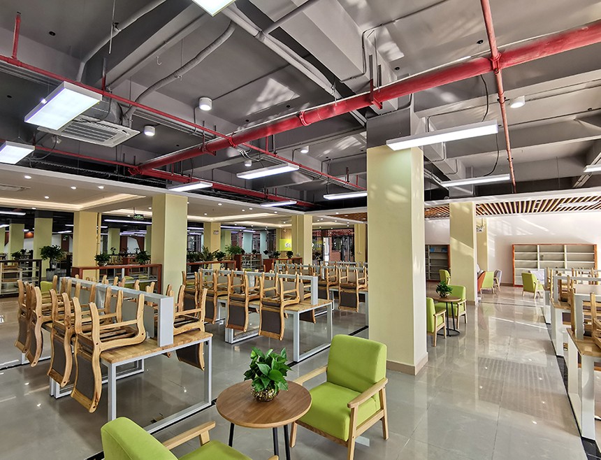 設計理念:此次項目是廣東學院南城校區圖書館閱覽室裝修工程。整個圖書館閱讀空間主色調定為白色、木色、淡綠色,還原清新自然的氛圍,喚醒青春歲月與校園生活氣息。