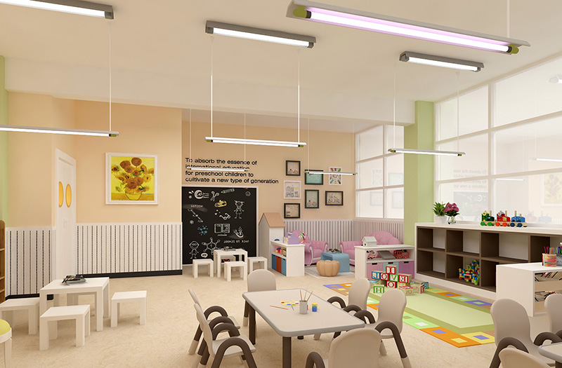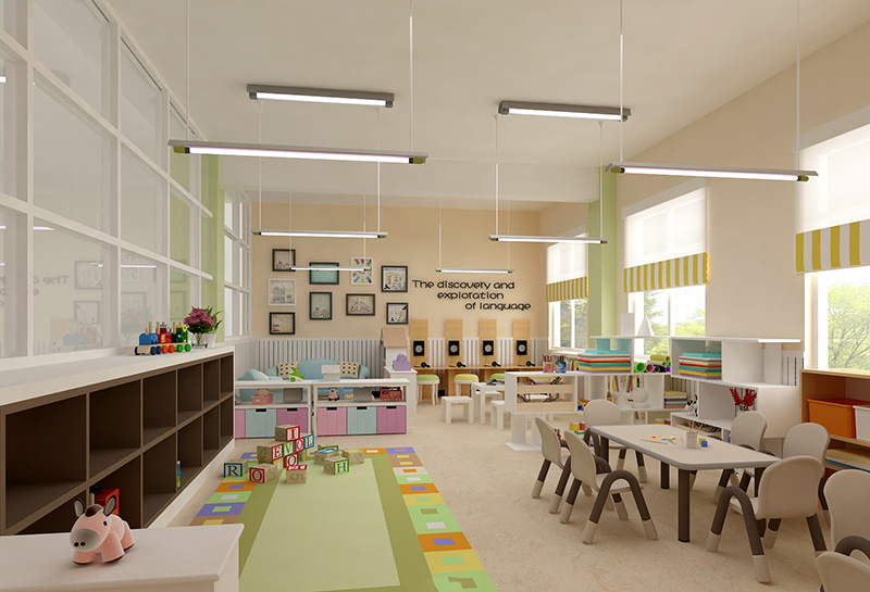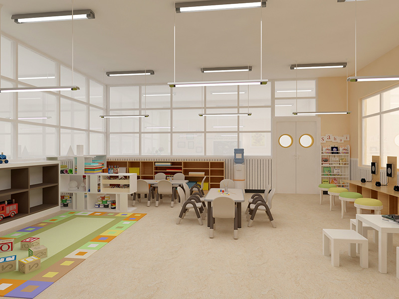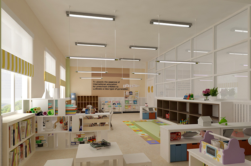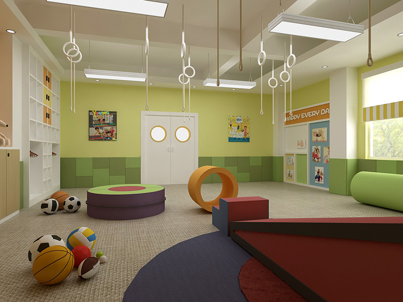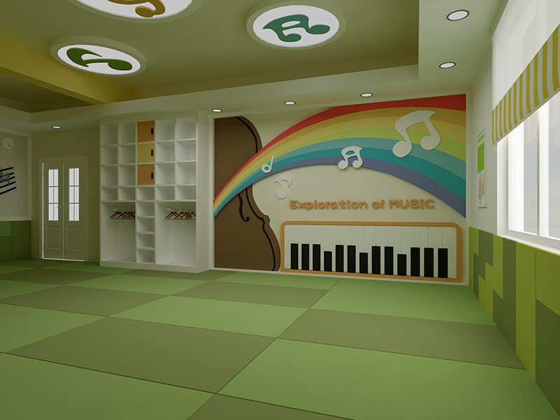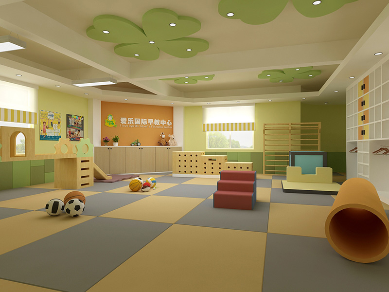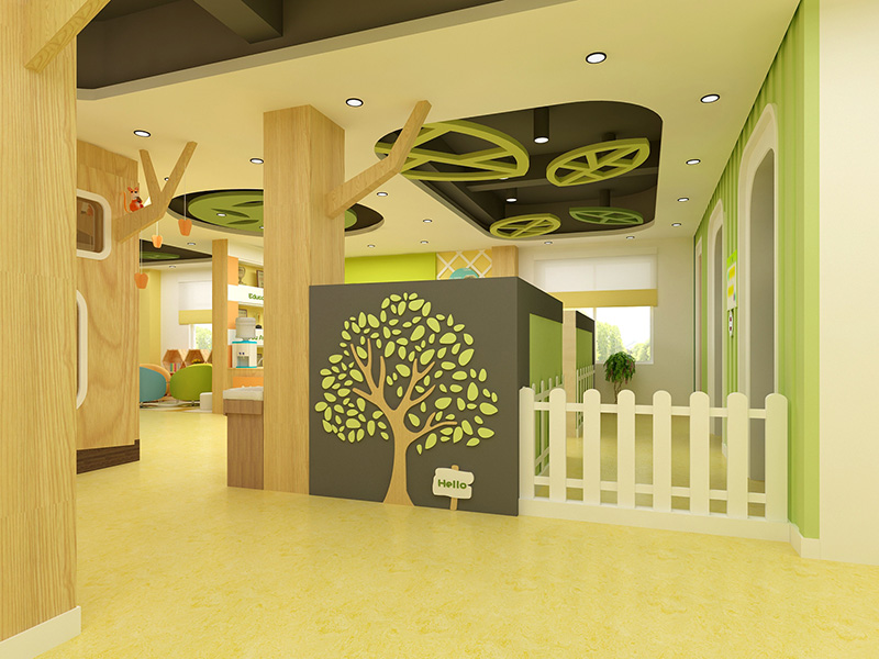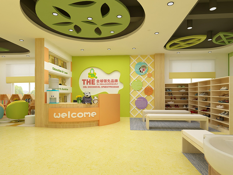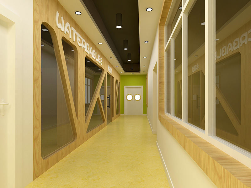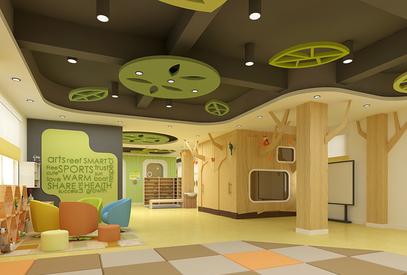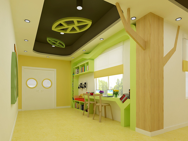 設計理念:本幼兒園設計案例基于兒童的心理及生理特點,設計師利用了顏色來表達情感。以淺橙色,蘋果綠作為主題色,分別代表了可愛柔和的親切感,活力明快的健康成長,清爽積極的探索思考。再加入了原木色的家具及柜體,使得整個空間在光線的映襯下顯得柔和,自然。大面積使用了原木墻板及原木假梁,這種秩序和結構的關系對幼小的孩子充滿了啟發性。